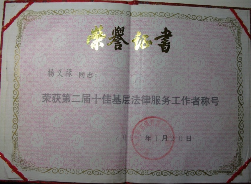 我所杨义禄主任从1996年从事法律工作,在工作中认真负责,为委托人挽回较大损失,得到社会的认可,被原万县市司法局2000年授予“十佳法律工作者称号”